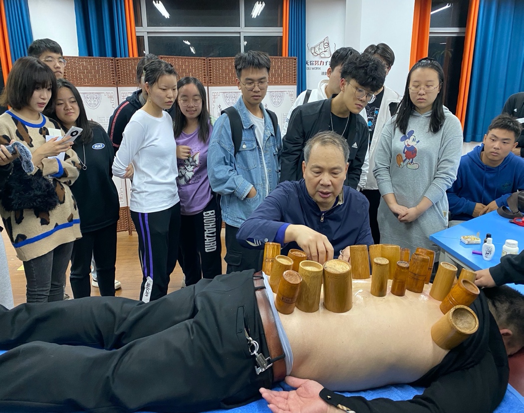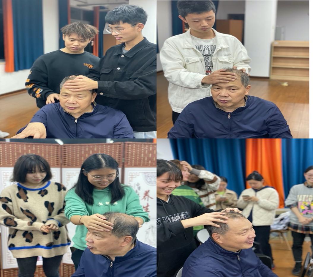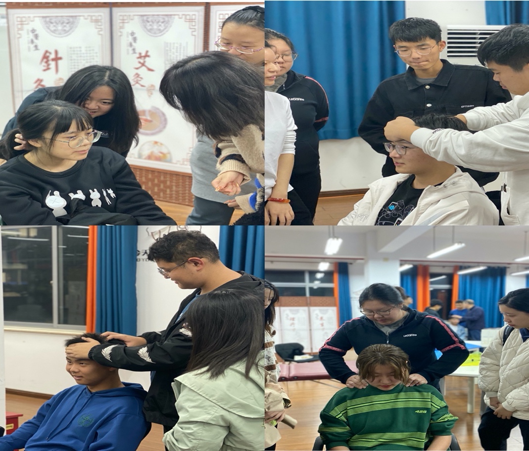 最后,学生们分成了小组进行操作练习。康复治疗专业的学哥、学姐们主动前来当小教员,耐心传教,手把手指导,帮助新同学掌握传统康复治疗的基本手法。学生们不仅热情满满,而且在练习时也十分认真专注。几位大胆的学生还在在张教授身上进行练习,张教授说这样学生可以获取更有效的建议和指导。