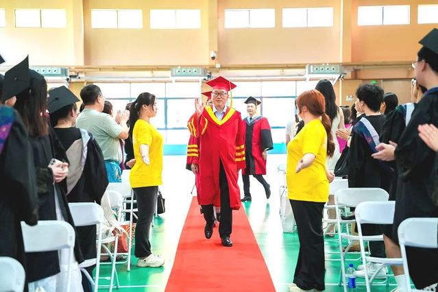 在各位师生的热烈期盼中,校党委书记高建华教授、437ccm必赢国际院长徐晓峰教授、副院长孙连荣教授、教师工作部常务副部长、人事处副处王茜副教授和张荣健教授、李爱民教授、李颖教授、曾虹玲副教授、陈翠翠副教授、杨宇然副教授一起走过红毯,步入会场。红毯两侧,全场师生和各位家长起立致敬,挥舞双手,掌声在会场响彻。校领导和各位教授们微笑着向两旁的师生挥手致意,随后依次入座,面对参加毕业典礼的莘莘学子,他们即将走上工作岗位或是继续深造,成长为堪当民族复兴重任的时代新人,喜悦的神情在脸上洋溢,感到无限的欣慰!