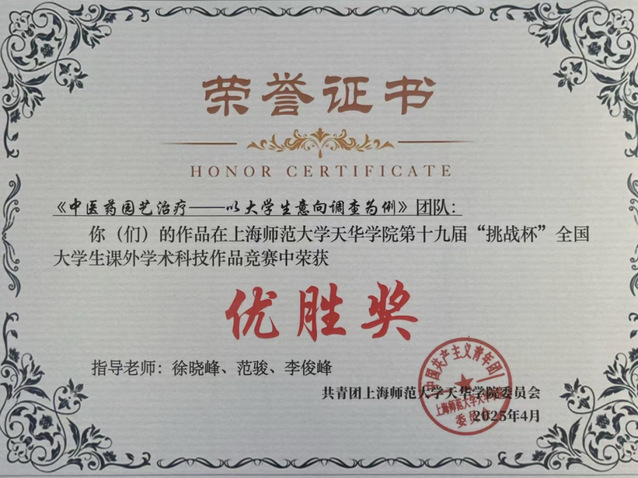在第十九届“挑战杯”上海大学生课外学术科技作品竞赛437ccm必赢国际校内赛决赛中,24级健康服务与管理专升本的葛圆丽同学带领团队凭借作品《中医药园艺治疗 —— 以大学生意向调查为例》斩获优胜奖。团队成员包括健康服务与管理专业学生孙佳瑜、刘茹萱、李梓菡、赵欣奕、马绍杰、马俊森。