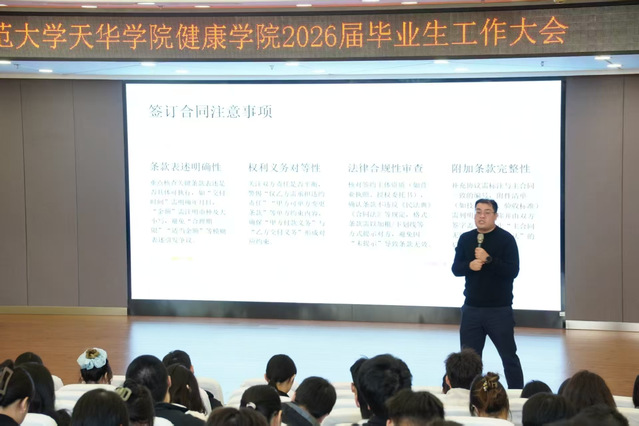 刘吉辉老师以“实习就业双安全保障”为核心展开讲解,从实习期间的安全防护、就业信息的来源甄别、转实习四联单与劳动合同的签订规范等方面进行详细说明。他着重强调,同学们在实习过程中需严守自身安全与隐私保护底线,严格遵守学院的请假及转实习规定。他希望每位同学都能以严谨的态度对待实习与就业,为未来的职业生涯奠定基础。