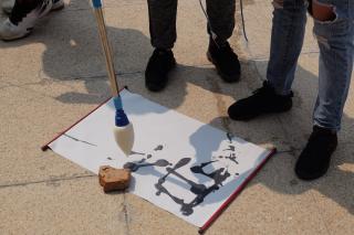 各小组分别执起系在大毛笔上的两段绳子,控制力度与方向在卷轴写字,通过默契配合完成写字。和两人三足有异曲同工之妙,没有足够的默契可是很难做到哦。