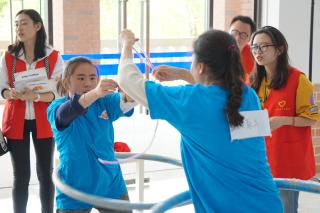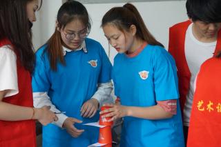 这是考验队友间的默契程度的游戏,两人合作完成,一名成员负责叠杯子,把杯子倒放,在杯子上放一张纸,一共是三层杯子。叠完杯子塔之后,另一位小组成员需要抽出各层杯子之间的纸,最后3张纸全部抽出且杯子塔不倒的小组完成任务。同学们虽然一开始有些紧张,但是在之后慢慢磨合的过程中,渐渐找到了游戏的方法,顺利的完成了项目。