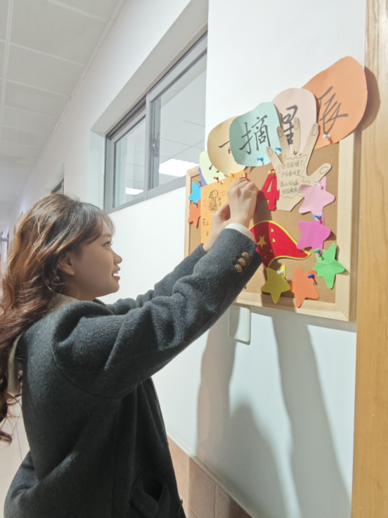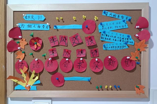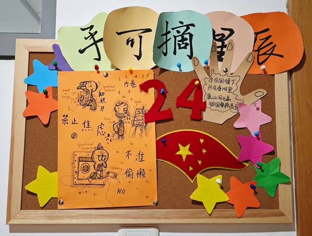 该班以“手可摘星辰”为励志主题,彩色纸张拼贴出鼓舞人心的文字,展现大家的昂扬斗志。手绘海报以鲜明话语,激励同学保持积极的心态。展板上飘扬的五星红旗,更是传达出深厚的爱国情怀,激励着学生们不断追求卓越,勇攀高峰。
