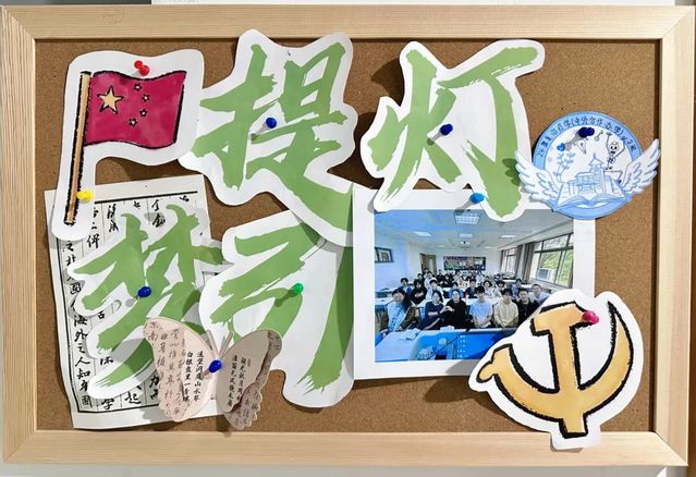 该班所设展板顶部高悬中国国旗,标志着同学们的爱国情怀与自豪。中央位置以鲜明的绿色大字书写“提灯梦引”,寓意着班级同学如同提灯人,怀揣着对未来的美好憧憬和梦想,坚定信念勇往直前,照亮前行的道路。班徽、党徽与书法作品等的巧妙融合,更加凸显班级的丰富文化底蕴。