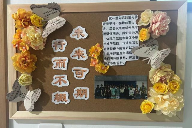 该班以精美的花卉装饰为背景,温馨而富有活力。展板中央,醒目的文字彰显了班级坚持不懈的奋斗精神和对未来充满无限期待的态度,下方的班级集体合影,不仅展示了同学们的青春风采,更象征着班级的团结,富有感染力。