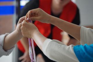 各小组分别执起系在大毛笔上的两段绳子,控制力度与方向在卷轴写字,通过默契配合完成写字。和两人三足有异曲同工之妙,没有足够的默契可是很难做到哦。