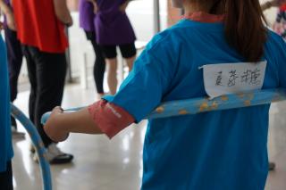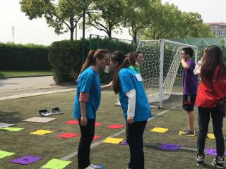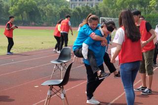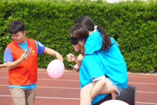 组内两名成员,一名用眼罩蒙住眼睛背起另一名,由被背起者指路行进并过障碍。在行进途中遇到凳子需绕行,遇到气球需踩爆,遇到卡片需立即立即捡起查看卡片内容,完成卡片内容指示,直至通过行进路上的所有障碍,方可冲刺通过终点。障碍并没有阻挡同学们的热情,一鼓作气,一直冲到了最后。