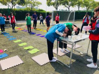 通过抽签决定盛水物,用嘴巴衔住盛水物通过指压板通道,在接力处把水杯用嘴巴衔住传递给自己的队友,继续通过指压板。在指压板上同时有跨栏等障碍物需通过。虽然在指压板上疼痛难忍,但是为了团队精神,大家又都再一次的克服了困难。
