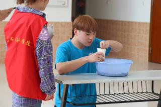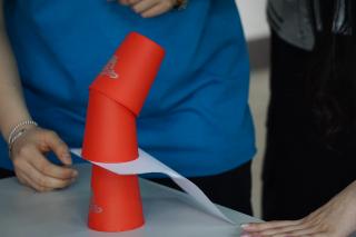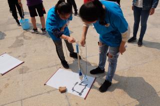 这是考验队友间的默契程度的游戏,两人合作完成,一名成员负责叠杯子,把杯子倒放,在杯子上放一张纸,一共是三层杯子。叠完杯子塔之后,另一位小组成员需要抽出各层杯子之间的纸,最后3张纸全部抽出且杯子塔不倒的小组完成任务。同学们虽然一开始有些紧张,但是在之后慢慢磨合的过程中,渐渐找到了游戏的方法,顺利的完成了项目。